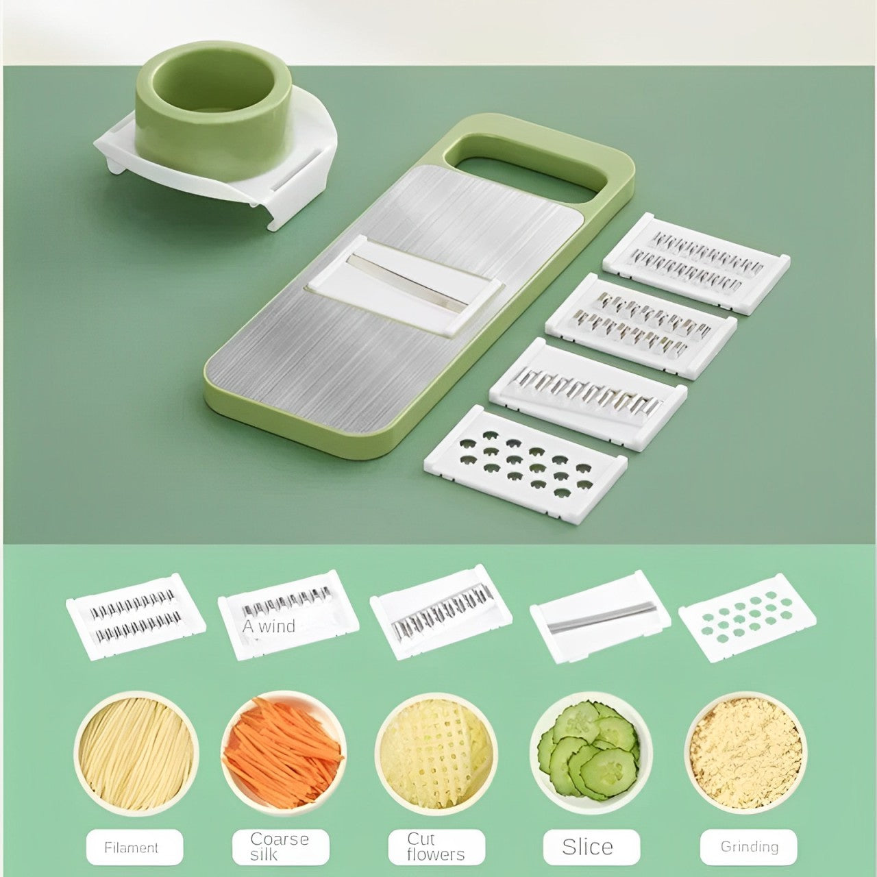 Multipurpose Functionality: Equipped with five different stainless steel blades, allowing for versatile cutting, slicing, grating, and julienning of vegetables and fruits.
